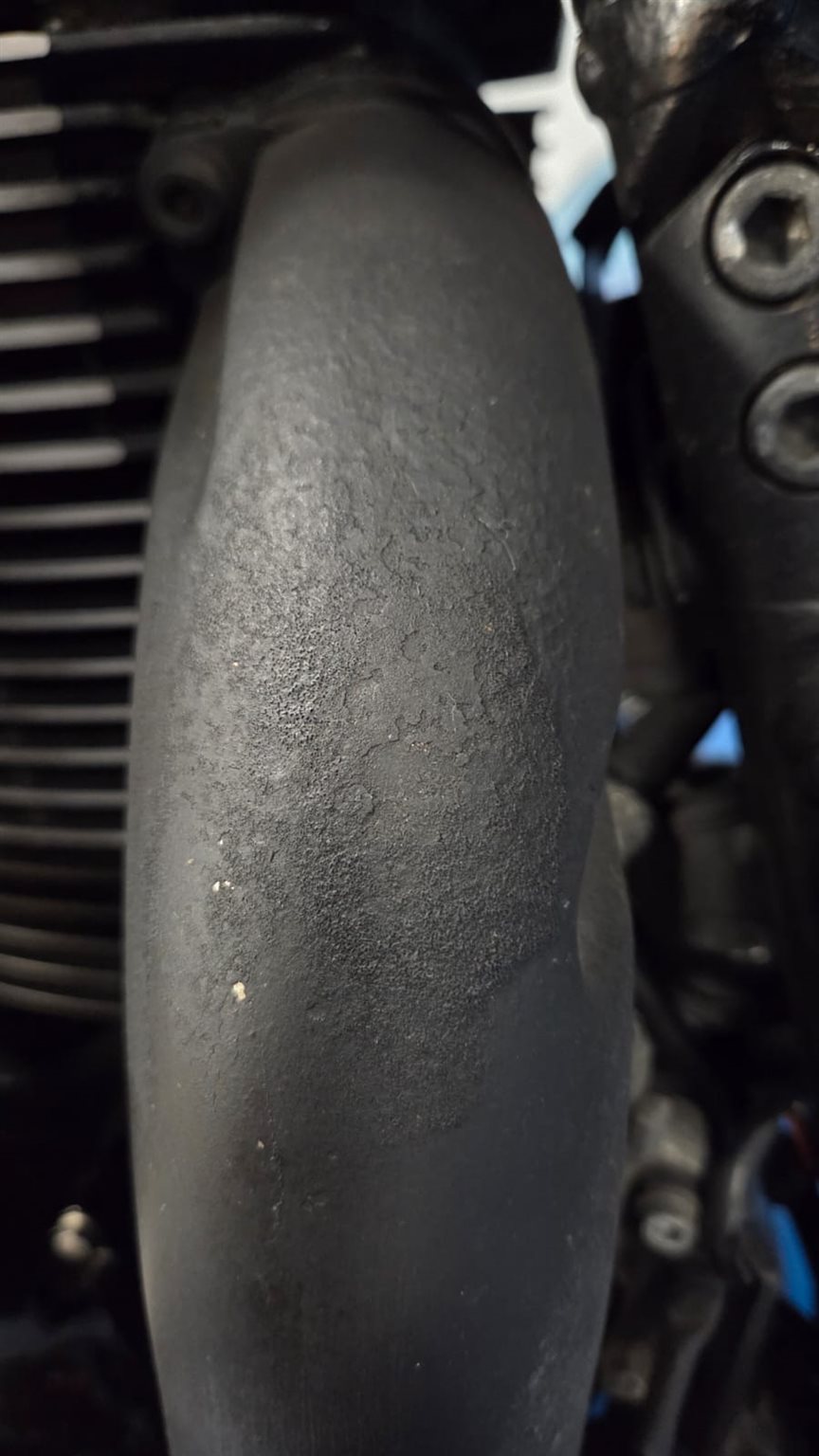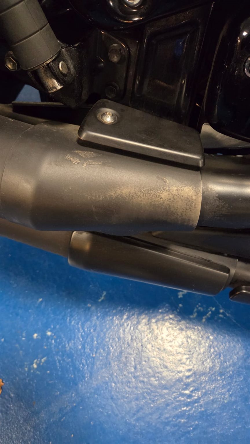 - Leichte Reste von angeschmirgelter Motorradplane am Auspuff
